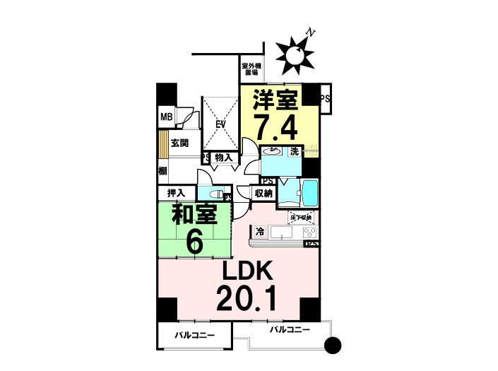 二面バルコニーのため採光・通風良好